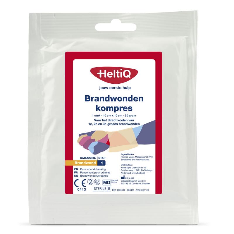 HeltiQ Brandwondenkompres is een met hydrogel verzadigd kompres dat direct koelt bij brandwonden als gevolg van vuur, stoom, hete vloeistoffen, stralingswarmte of andere niet chemische warmtebronnen. U gebruikt het kompres als eerste hulp bij de beginfase van de brandwond wanneer er op de locatie waar u zich bevindt geen water aanwezig is, of op lichaamsdelen waarbij u lastig kunt koelen met lauwwarm water, bijvoorbeeld in het gezicht. Het brandwondenkompres kunt u ook als aanvulling op het koelen met lauwwarm water gebruiken.