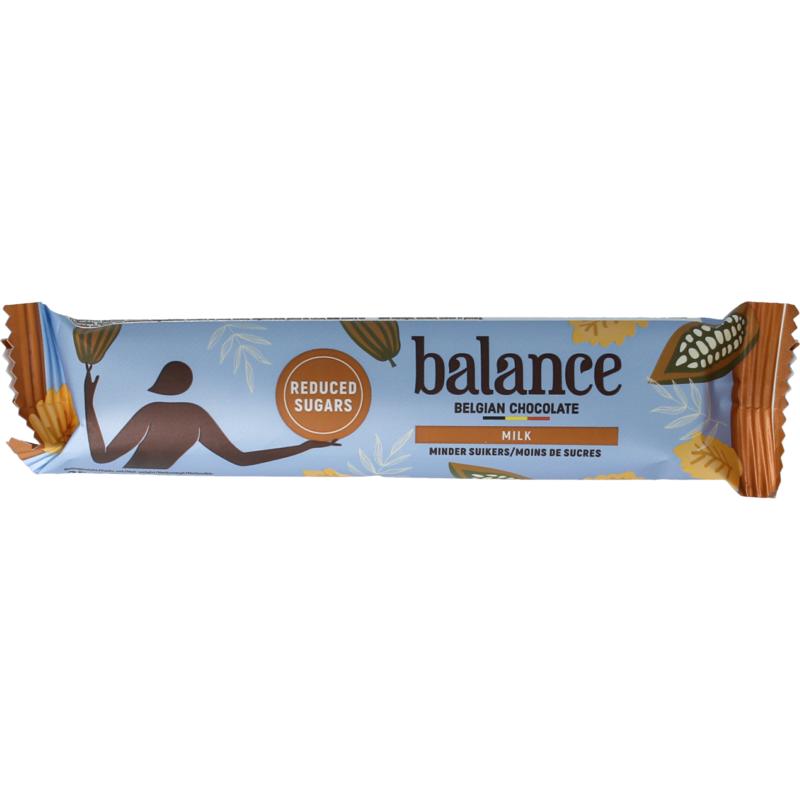 Balance is Belgische chocolade, verkrijgbaar in 3 smaken, puur, melk en met praline, zonder toegevoegde suikers, gezoet met steviolglycosiden en slechts 10% maltitol. Beide zoetstoffen zijn geschikt voor diabeten. Deze geven ook geen krampen in de darmen (10% maltitol geeft dit effect niet). Ingredienten: Cacaoboter, vezels: inuline, VOLLE MELKPOEDER, cacaomassa, MAGERE MELKPOEDER, zoetstof: maltitol, emulgator: SOJA LECITHINE, zoetstof: steviolglycoside, natuurlijke aroma's. Kan sporen bevatten van noten