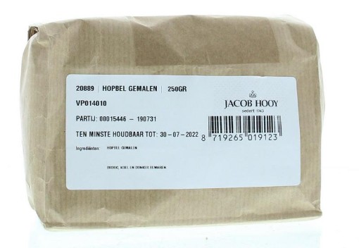 Ingredienten Hopbel gemalen Humulus lupulus flos. Gebruik Te bereiden als thee. Fabrikant Jacob Hooy & Co. BV Rijksweg 119 1906 BG Limmen