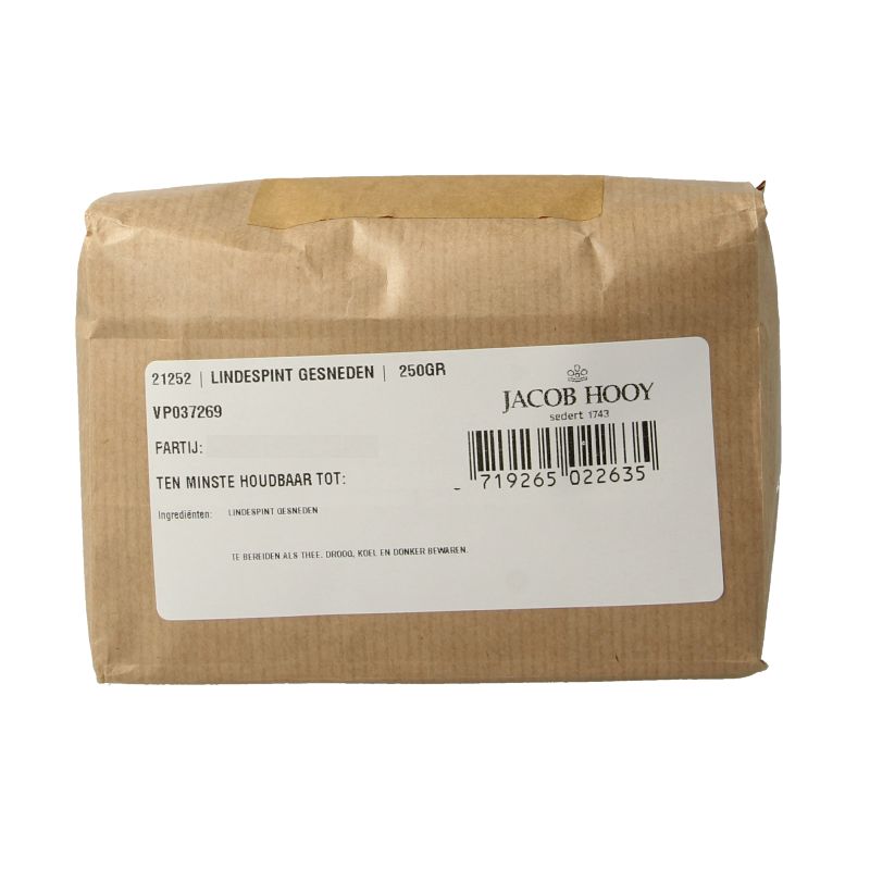 Ingredienten Lindespint (Cortex tiliae/Tilia cordata mill.) Herkomst: Hongarije Gebruik 50 gram spint 15 minuten op een liter water zachtjes koken, filteren en verdeeld over 2 dagen opdrinken. Droog en afgesloten bewaren. Fabrikant Jacob Hooy & Co BV Rijksweg 119 1906 BG Limmen