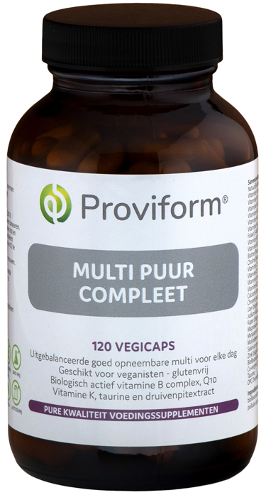 Multi Puur Compleet is een uitgebalanceerde formule met biologisch actieve ingrediënten en goed opneembare mineralen, die een complete basis biedt voor dagelijks gebruik. Toevoeging van het bioflavonoïdencomplex uit citrus, stabiele vorm vitamine K2, ginseng, groene thee en co-enzym Q10 bio-actief, vormen een waardevolle aanvulling. Multi Puur Compleet is een ideale aanvulling voor iedere leefstijl.