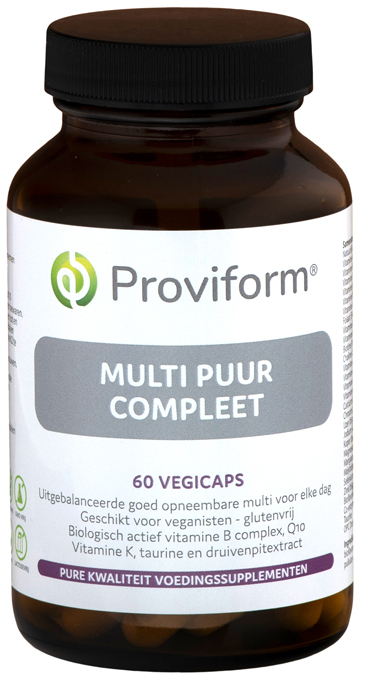 Multi Puur Compleet is een uitgebalanceerde formule met biologisch actieve ingrediënten en goed opneembare mineralen, die een complete basis biedt voor dagelijks gebruik. Toevoeging van het bioflavonoïdencomplex uit citrus, stabiele vorm vitamine K2, ginseng, groene thee en co-enzym Q10 bio-actief, vormen een waardevolle aanvulling. Multi Puur Compleet is een ideale aanvulling voor iedere leefstijl.