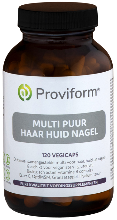 De structuur van gezonde haren, nagels en huid lijkt erg op elkaar. Ze hebben ook grotendeels dezelfde bouwstoffen nodig. In Proviform Multi Puur Haar Huid Nagel zijn deze bouwstoffen in een complete formule gecombineerd.