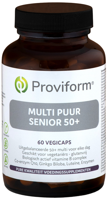 Deze uitgebreide multi vitamine met biologisch actieve ingrediënten en goed opneembare mineralen bevat vitamines en mineralen in de juiste verhouding voor de actieve 50-plusser. Multi puur Senior 50+ bevat een hoge dosis natuurlijke vitamine D3 voor de botten, maagvriendelijke vitamine C en luteïne met zeaxanthine (bestanddelen van de macula). Deze multi is vrij van ijzer omdat de behoefte aan ijzer afneemt naarmate men ouder wordt. Toevoeging van de zeer stabiele vitamine K2 (vitaMK7®) en vitamine K1, actief alfa liponzuur, actief co-enzym Q10, ginkgo biloba, ashwaganda, bromelaïne en betaïne vormen een waardevolle en gepaste aanvulling.