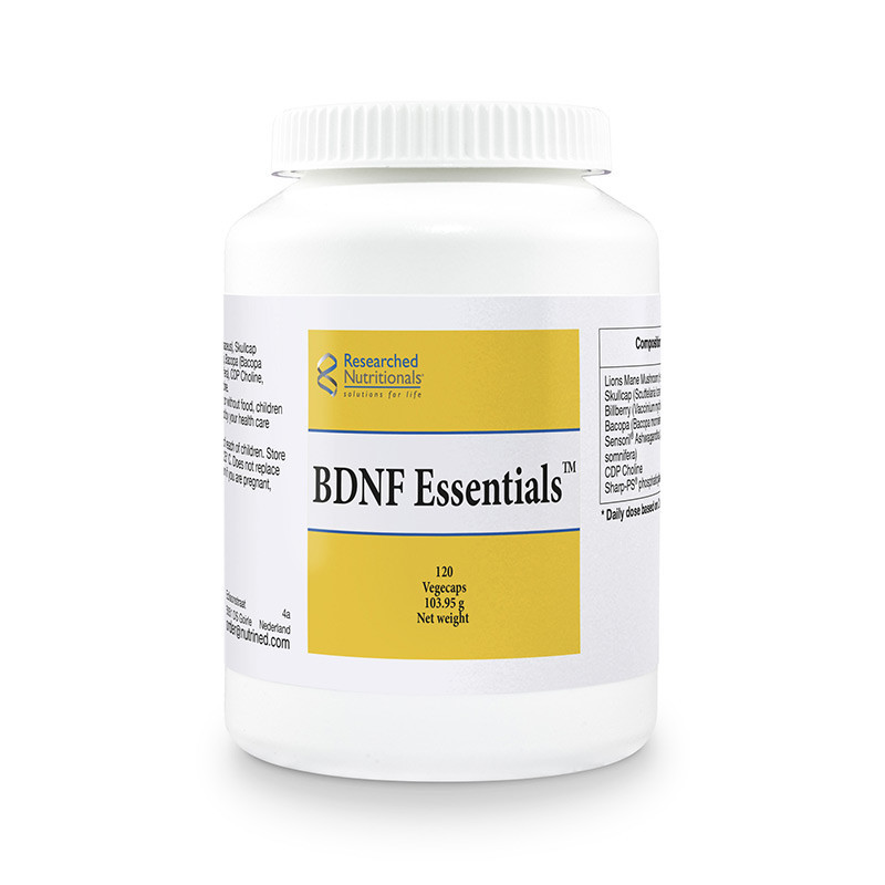 Nutrined BDNF Essentials bevat 120 capsules en is een voedingssupplement van het Amerikaanse merk Researched Nutritionals. BDNF staat voor Brain Derived Neurotrophic Factor. Dit supplement bevat verschillende kruidenextracten, paddenstoelen extract en fosfolipiden.