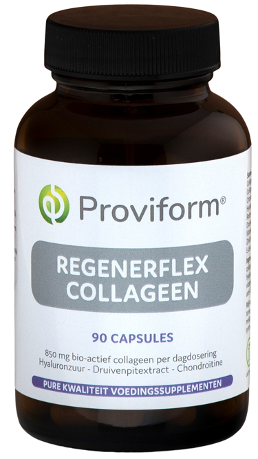 Proviform RegenerFlex Collageen Compleet bevat een uitgekiende samenstelling van 2 soorten collageen in combinatie met chondroïtinesulfaat, hyaluronzuur, rode wijnextract, druivenpitextract, zuurvrije vitamine C en goed opneembare zink.