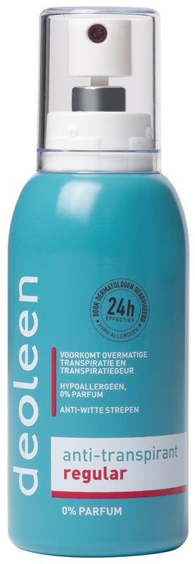 Deoleen Regular Spray voorkomt 24 uur lang overmatige transpiratie en onaangename geurtjes. De spray is hypoallergeen en geeft geen witte strepen op kleding. Bevat 0% parfum. Aanbevolen door dermatologen.