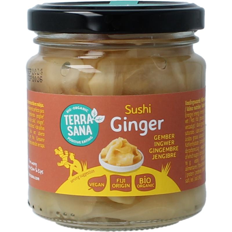 Deze flinterdunne plakjes ingelegde gember gebruik je als bijgerecht bij sushi, samen met wasabi en sojasaus. Japanners eten sushi gember tussen de hapjes sushi door, omdat gember smaken neutraliseert. Zo komt ieder stukje sushi optimaal tot zijn recht. Sushi gember is ook lekker bij een salade, op een broodje of een (vega) hamburger. We gebruiken eersteklas biologische gember uit het paradijselijke Fiji: eilanden met één van de schoonste bodems ter wereld.