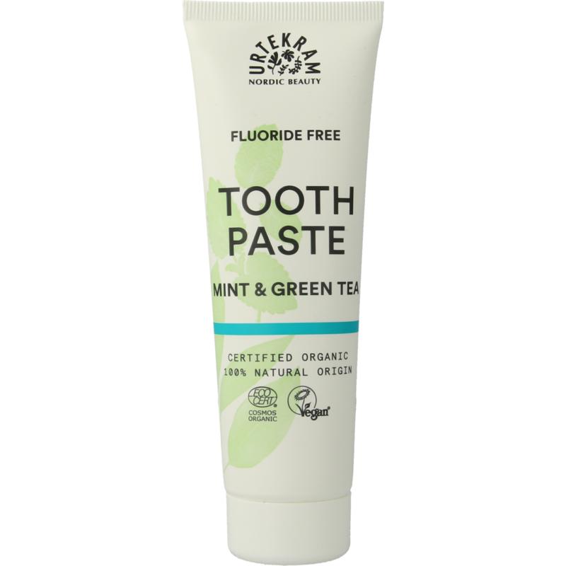 De verfrissende smaak van munt gecombineerd met een dosis groene thee. Het schijnt dat de polyfenolen in groene thee een positief effect hebben op onze tanden en het tandvlees. Onderzoekers van de universiteit van Illinois in de Verenigde Staten zijn na uitgebreid onderzoek tot deze conclusie gekomen. Verder is deze tandpasta een pure natuurlijke krachtpatser. Het gebuikte kalk is miljoenen jaren geleden ontstaan en wordt gewonnen op de zeebodem om vervolgens voor verdere verwerking te worden verpulverd. Dat is ook de reden waarom deze tandpasta de kenmerkende lichtgrijze kleur van natuurlijk kalk heeft. Verder bevat deze tandpasta een flinke dosis aloë vera, wat het tandvlees helpt beschermen en verzorgt. En als extraatje is er een beetje mirre toegevoegd, dat bekend staat om zijn desinfecterende werking.