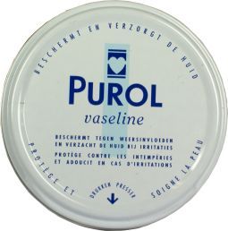 Purol Vaseline blikje Purol Vaseline is een zuurloze en geurloze, transparante, vette zalf voor gezicht en lichaam. Het is geschikt voor elk huidtype, ook de gevoelige huid. Beschermt tegen weersinvloeden en verzacht de huid Ingredienten Petrolatum. Gebruik Als bescherming van de huid bij extreme invloeden: guur en koud weer, extreme droogte en bij huidirritaties als gesprongen lippen en luieruitslag. Buiten bereik van kinderen houden. Waarschuwingen Alleen voor uitwendig gebruik