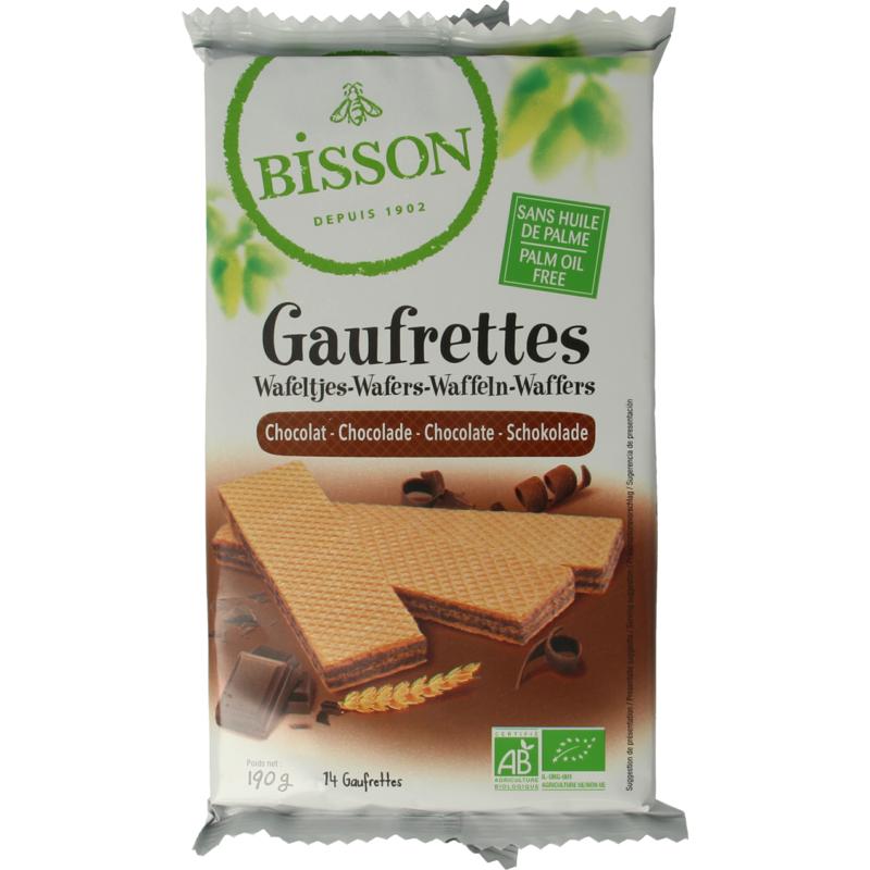 Biologische Bisson Wafels met chocolade zijn palmolievrij en bevatten 35% chocolade. Elke verpakking bevat 14 wafels.
